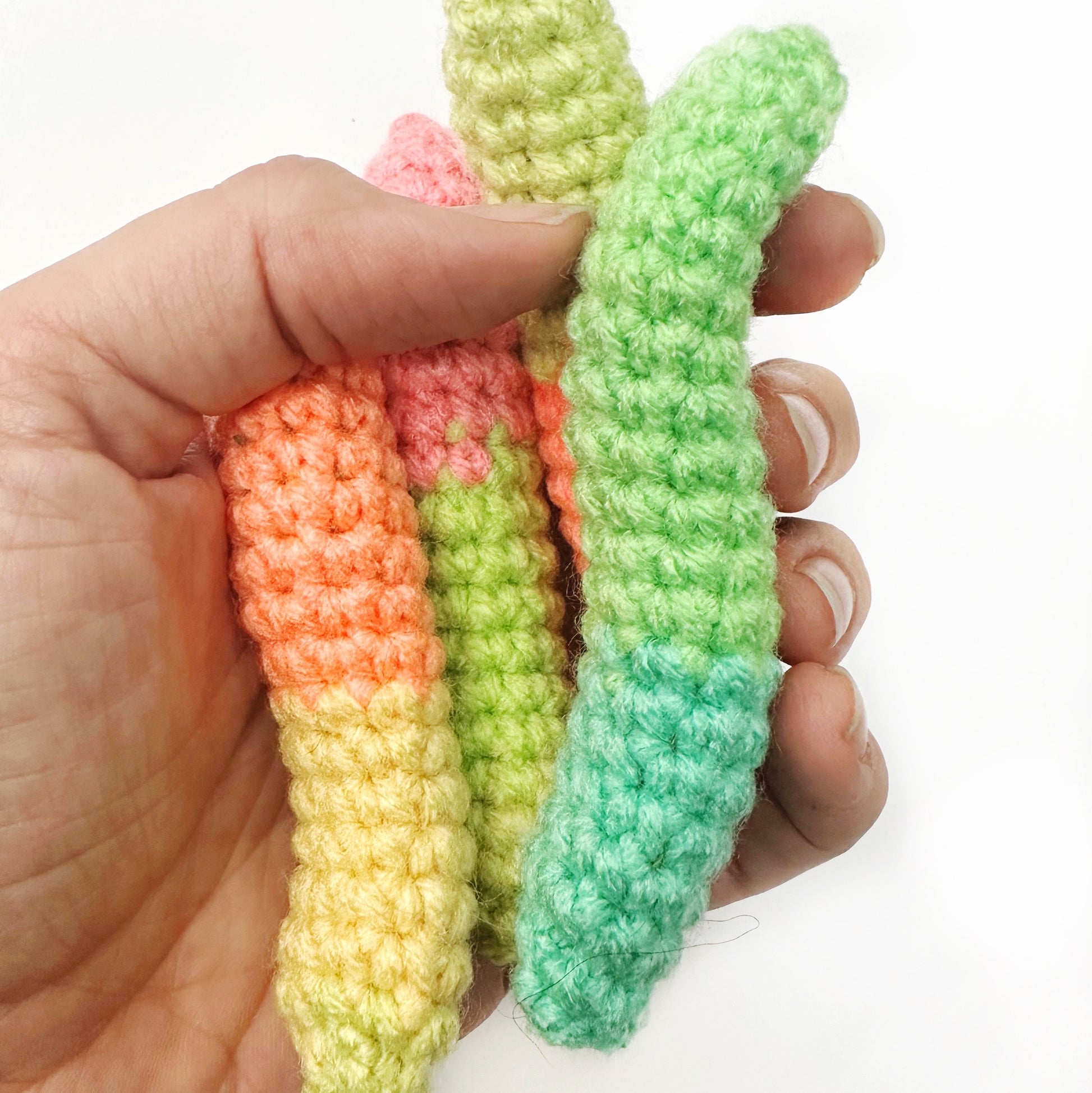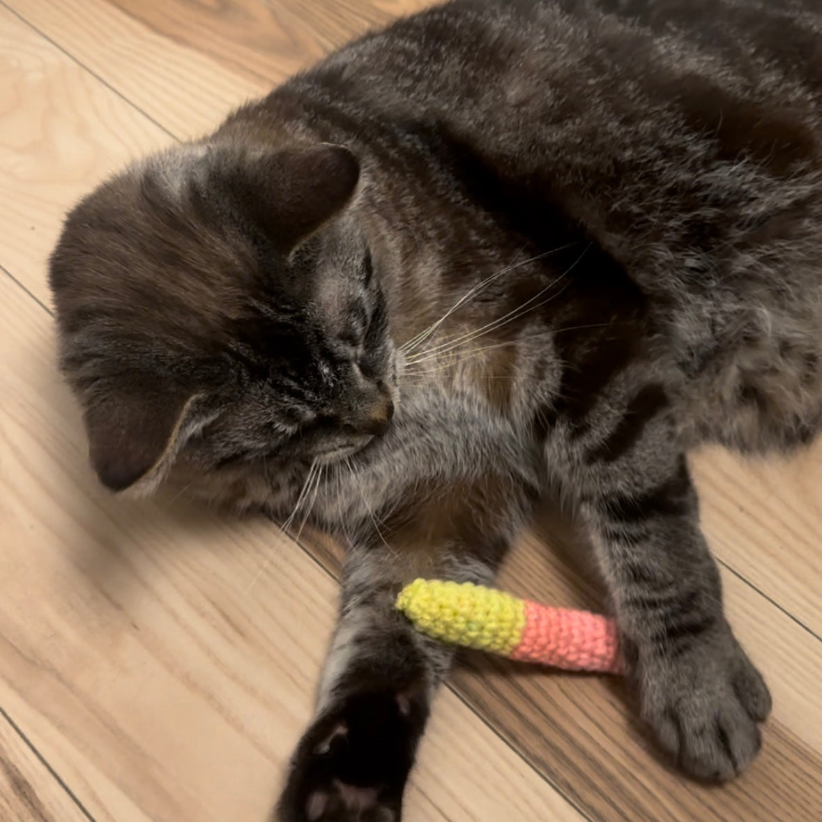 Each gummy worm toy is lovingly crocheted by hand, and filled with soft stuffing and a high-quality organic catnip and silver vine blend that your cat will be obsessed with! The blend of cat-attracting herbs is great for picky cats and encouraging older cats to play!