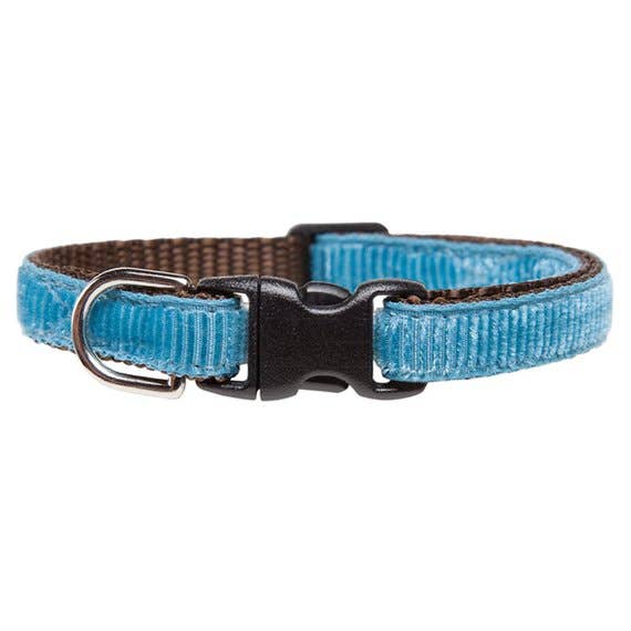 The Graduate cat collar features beautiful gray blue french corduroy. The perfect look for the scholarly kitty.