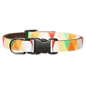 The Raise + Shine cat collar features a festive orange triangle print. This bright look is the perfect final touch for the kitty who always ready to conquer the day.